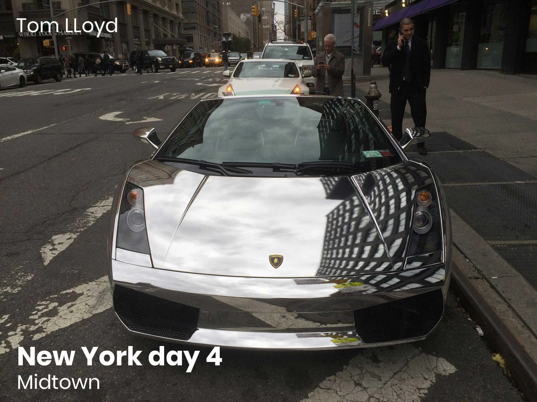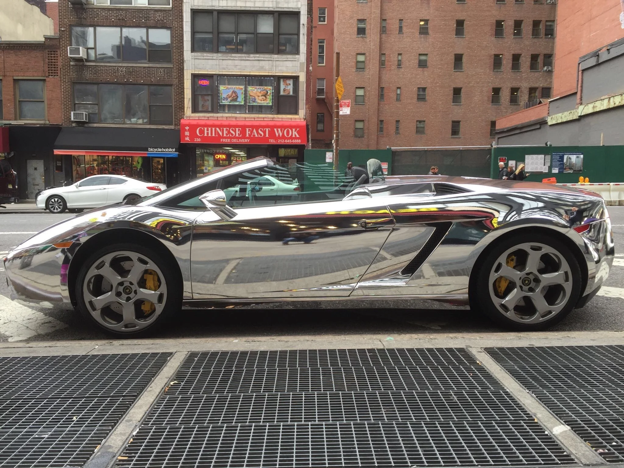 I've been walking for an hour. I'm on 7th Avenue heading towards Madison Square Garden when I see the most amazing chromed up Lamborghini. The owner is standing on the sidewalk on his cell phone. He looks like Tom Cruise. I wonder if he's really on the phone or just using it as an excuse to be seen standing with his car. Other people are taking photos. He kindly opens the door and let's a little girl sit in the drivers seat. I ask him for a ride - he smiles but he keeps taking into his phone.