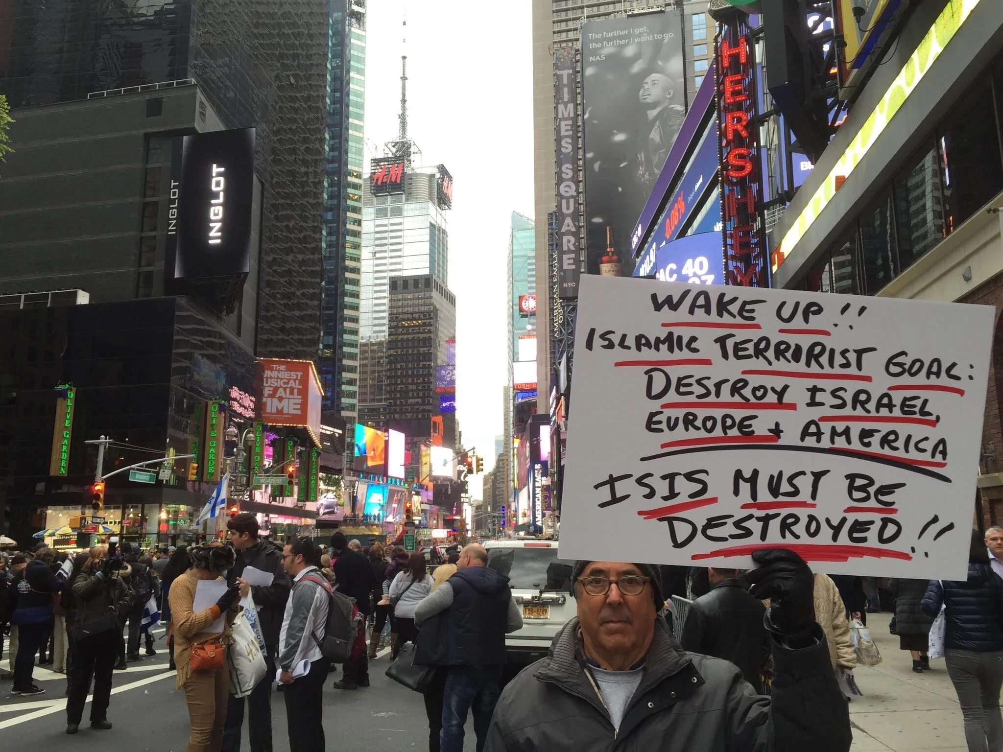 There a pro-Israel demo. A whole block has been cordoned off and the police are heavily armed and scanning people for weapons before they’re let through the crowd barriers. Though I like the music (an old guy is playing on a stage) I decide to move on quickly.